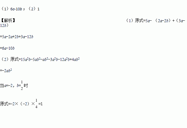 (2)先化简,再求值:5(3a2b-ab2)-(ab2+3a2b)-4(3a2b-ab2). 其中a=-2,b=