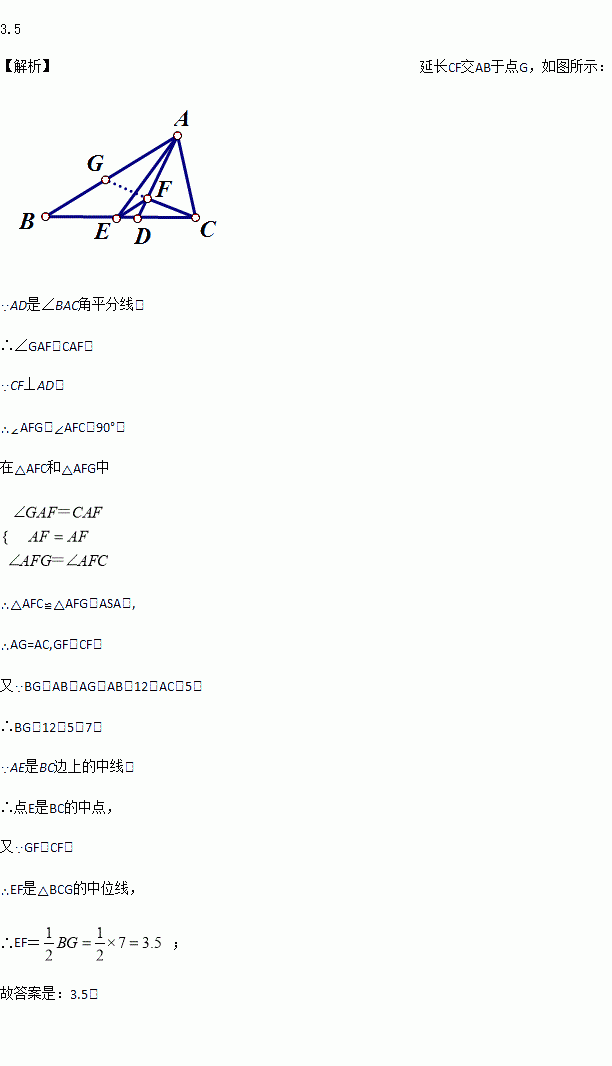 如图,ΔABC中,AB=12,AC=5,AD是∠BAC角平分线,AE是BC边上的中线,过点C做CF⊥AD于F,连接EF,则线段EF的长为____________.