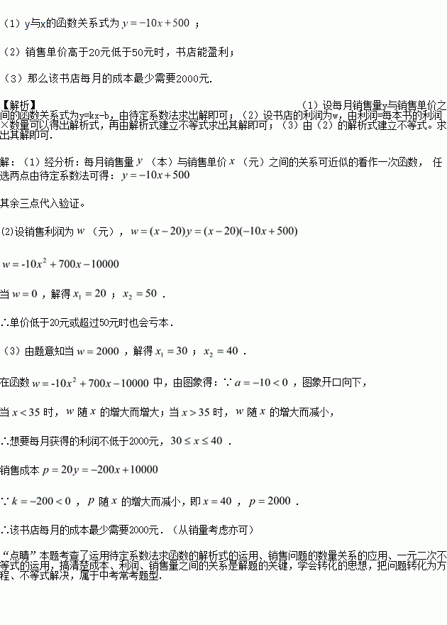 (3)如果想要每月获得的利润不低于2000元,那么该书店每月的成本最少需要多少元?(成本=每本进价×销售量)
