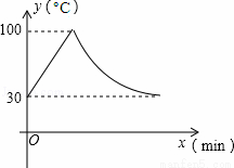 教室里的饮水机接通电源就进入自动程序,开机加热时每分钟上升10℃,加热到100℃,停止加热,水温开始下降,此时水温(℃)与开机后用时(min)成反比例关系.直至水温降至30℃,饮水机关机.饮水机关机后即刻自动开机,重复上述自动程序.若在水温为30℃时,接通电源后,水温y(℃)和时间(min)的关系如图,为了在上午第一节下课时(8:45)能喝到不超过50℃的水,则接通电源的时间可以是当天上午的( )