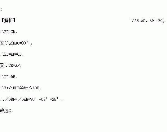 如图,在Rt△ABC中,AB=AC,AD⊥BC,垂足为D.E、F分别是CD、AD上的点,且CE=AF.如果∠AED=62º,那么∠DBF=( )。