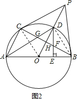 分析 (1)连接CO,如图1,易证∠COD=∠DOB,从而可证到△COP≌△BOP,则有∠OCP=∠OBP.根据切线的性质可得∠OBP=90°,即可得到∠OCP=90°,从而可得PC为⊙O的切线;