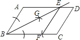 分析:(1)①以点B为圆心,以任意长为半径画弧,分别交AB、BC于两点,再分别以这两点为圆心,以任意长为半径画弧,两弧交于一点G,连接BG并延长交AD于点E,则BE即为所求.