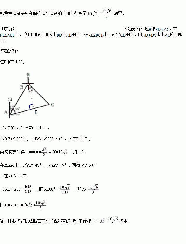 南海是我国的南大门,如图所示,某天我国一艘海监执法船在南海海域正在进行常态化巡航,在A处测得北偏东30°方向上,距离为20海里的B处有一艘不明身份的船只正在向东南方向航行,便迅速沿北偏东75°的方向前往监视巡查,经过一段时间后在C处成功拦截不明船只,问我国海监执法船在前往监视巡查的过程中行驶了多少海里?