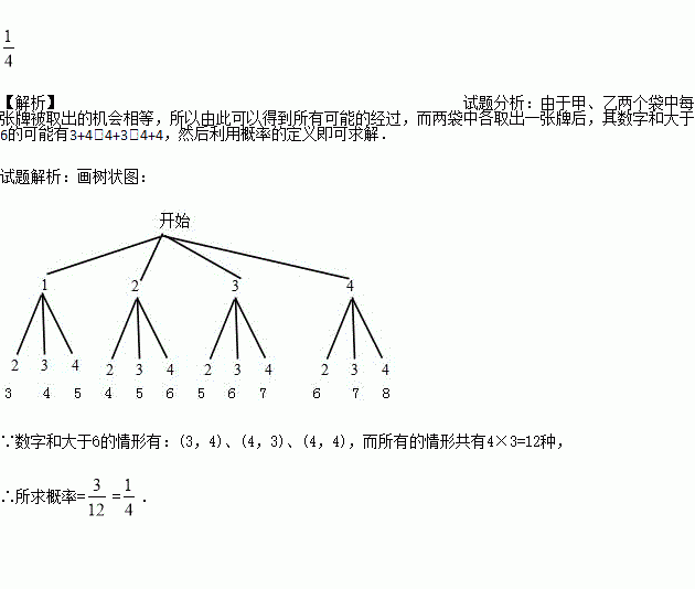 如图,甲袋内共有4张牌,牌面分别标记数字1,2,3,4;乙袋内共有3张牌,牌面分别标记数字2,3,4.甲袋中每张牌被取出的机会相等,且乙袋中每张牌被取出的机会也相等。分别从甲乙两袋中各随机抽取一张牌,请用列表或画树形图的方法,求抽出的两张牌面上的数字之和大于6的概率。(8分)