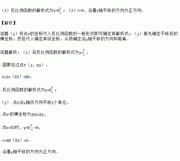 (2)若将点P沿x轴负方向平移3个单位,再沿y轴方向平移n(n>0)个单位得到点P′,使点P′恰好在该函数的图象上,求n的值和点P沿y轴平移的方向.