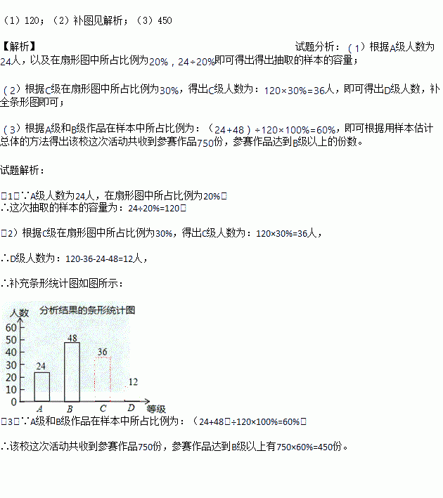 (3)已知该校这次活动共收到参赛作品750份,请你估计参赛作品达到B级以上(即A级和B级)有多少份?