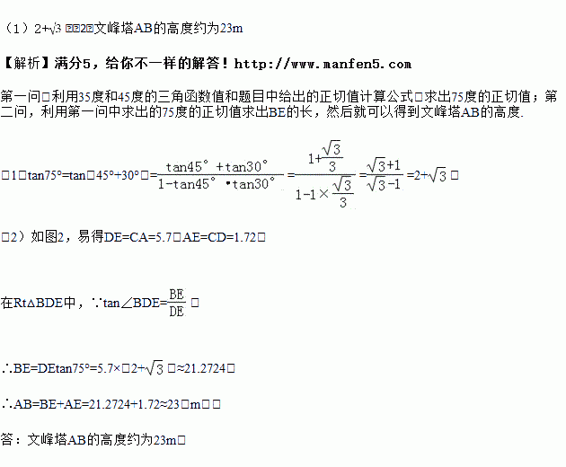 (2)都匀文峰塔,原名文笔塔,始建于明代万历年间,系五层木塔.文峰塔的木塔年久倾毁,仅存塔基.1983年,人民政府拨款维修文峰塔,成为今天的七层六面实心石塔(图1),小华想用所学知识来测量该铁塔的高度,如图2,已知小华站在离塔底中心A处5.7米的C处,测得塔顶的仰角为75°,小华的眼睛离地面的距离DC为1.72米,请帮助小华求出文峰塔AB的高度.(精确到1米,参考数据