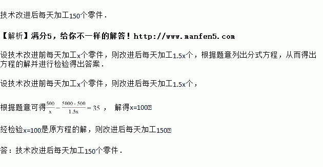 珠海某企业接到加工“无人船”某零件5000个的任务.在加工完500个后,改进了技术,每天加工的零件数量是原来的1.5倍,整个加工过程共用了35天完成.求技术改进后每天加工零件的数量.