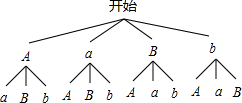 解答 解:(1)∵可能的结果有:Aa,Ab,Ba,Bb,恰好属于同一个专家光碟的有:Aa,Bb,