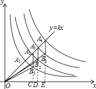 分析 根据反比例函数$y=\frac{k}{x}$中k的几何意义,求得${S}_{△{{OA}_{2}B}_{1}}$=${S}_{{△A}_{2}OC}$-${S}_{△{OB}_{1}C}$=$\frac{1}{2}$×(2-1)=$\frac{1}{2}$,${S}_{△{{OA}_{3}B}_{2}}$=${S}_{{△A}_{3}OD}$-${S}_{{△B}_{2}OD}$=$\frac{1}{2}$×(3-2)=$\frac{1}{2}$,…${S}_{{{△OA}_{2014}B}_{2013}}$=$\frac{1}{2}$,得到△OA2B1,△OA3B2,…,△OA2014B2013的面积之和=2013×$\frac{1}{2}$=$\frac{2013}{2}$.