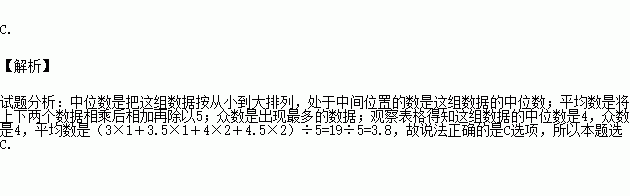 A.中位数是4,平均数是3.75 B.众数是4,平均数是3.75