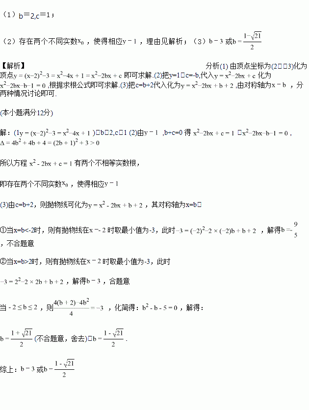 (1)若抛物线的顶点坐标为(2,-3),求b,c的值;