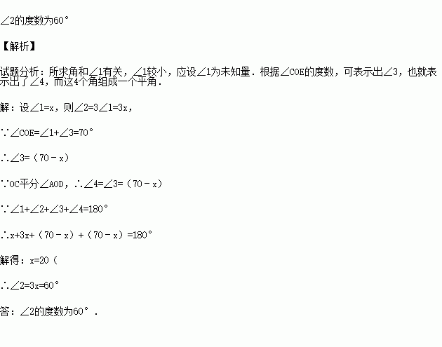 (2010•大连校级自主招生)如图,已知O为直线AB上一点,过点O向直线AB上方引三条射线OC、OD、OE,且OC平分∠AOD,∠2=3∠1,∠COE=70°,求∠2的度数.