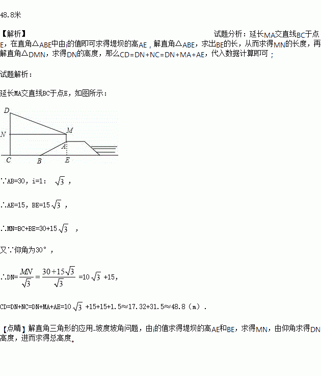 ,且AB=30m,李亮同学在大堤上A点处用高1.5m的测量仪测出高压电线杆CD顶端D的仰角为30°,己知地面BC宽30m,求高压电线杆CD的高度(结果保留一位小数,
