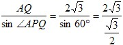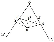 | 解:(1)过点P作PQ⊥AB于点Q, ∵PA=PB,∠APB=120°,AB=4 ∴AQ= ∠APQ= 在Rt△APQ中,sin∠APQ= ∴AP= (2)过点P分别作PS⊥OM于点S,PT⊥ON于点T, ∴∠OSP=∠OTP=90°, 在四边形OSPT中, ∠SPT=360°﹣∠OSP﹣∠SOT﹣∠OTP =360°﹣90°﹣60°﹣90° =120°, ∴∠APB=∠SPT=120°, ∴∠APS=∠BPT, 又∵∠ASP=∠BTP=90°,AP=BP, ∴△APS≌△BPT, ∴PS=PT, ∴点P在∠MON的平分线上; (3)①8+4 |