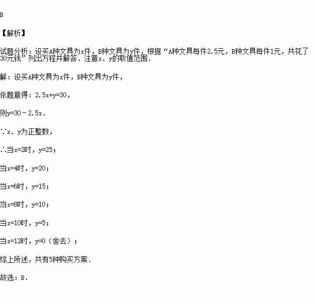 (2015秋•深圳期末)张老师到文具店购买A、B两种文具,A种文具每件2.5元,B种文具每件1元,共花了30元钱,则可供他选择的购买方案的个数为(两样都买)( )