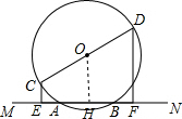 分析 (1)作OH⊥MN于H,如图,由OH⊥MN,CE⊥MN,DF⊥MN,得到CE∥OH∥BF,易得OH为梯形EFDC的中位线,根据梯形的中位线性质得CH=DH,再根据垂径定理得到AH=BH,然后利用等量减等量差相等即可得到CE=DF.
