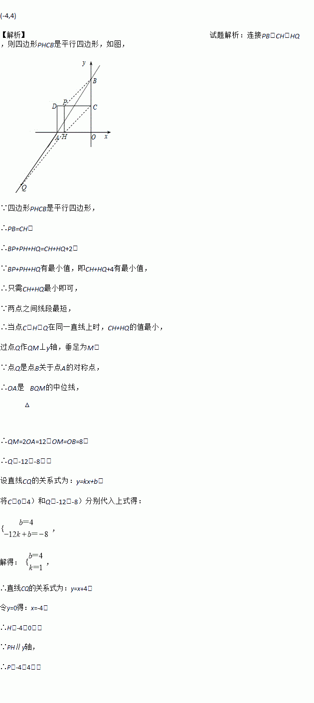 x+8分别交x轴,y轴于A,B两点,点C为OB的中点,点D在第二象限,且四边形AOCD为矩形.动点P为CD上一点,PH⊥OA,垂足为H,点Q是点B关于点A的对称点,当BP+PH+HQ值最小时,点P的坐标为_____________________