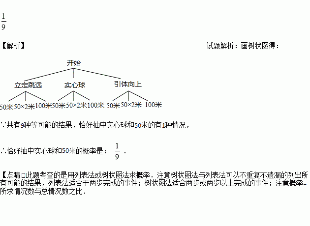 中考体育男生抽测项目规则是:从立定跳远、实心球、引体向上中随机抽一项,从50米,50×2米,100米中随机抽一项,恰好抽中实心球和50米的概率是 _____