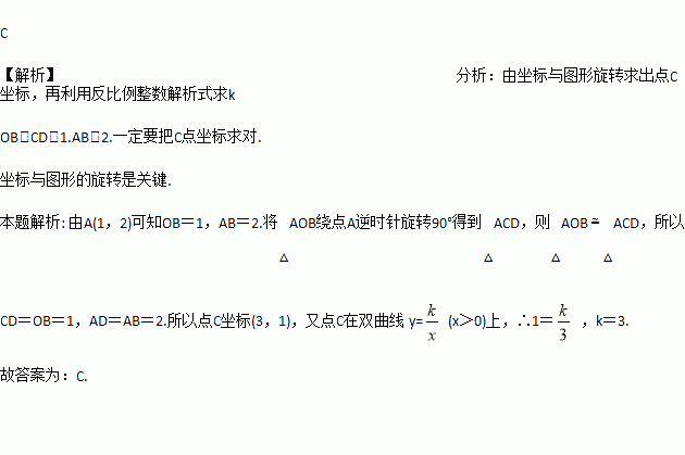中,点A(1,2),∠OBA=90º,OB在x轴上.将△AOB绕点A逆时针旋转90º,点O的对应点C恰好落在双曲线