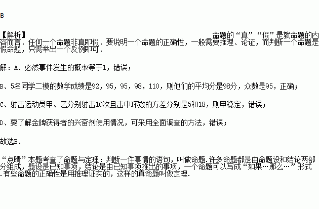 C. 射击运动员甲、乙分别射击10次且击中环数的方差分别是0.5和1.2,则乙较稳定;