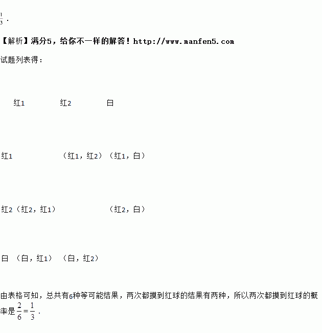 在一个不透明的空袋子里,放入仅颜色不同的2个红球和1个白球,从中随机摸出1个球后不放回,再从中随机摸出1个球,两次都摸到红球的概率是______.