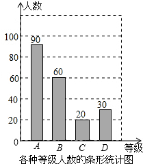 分析:(1)根据所有等级的百分比的和为1,则可计算出x=30,再利用A等级的人数除以它所占的百分比得到调查的总人数为200人,然后分别乘以30%和20%得到B等级和C等级人数,再将条形统计图补充完整;