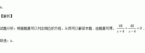 A、B两地相距48千米,一艘轮船从A地顺流航行至B地,又立即从B地逆流返回A地,共用去9小时,已知水流速度为4千米/时,若设该轮船在静水中的速度为x千米/时,则可列方程为( ).