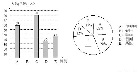某中学数学兴趣小组为了解本校学生对电视节目的喜爱情况,随机调查了部分学生最喜爱哪一类节目(被调查的学生只选一类并且没有不选择的),并将调查结果制成了如下的两个统计图(不完整).请你根据图中所提供的信息,完成下列问题: