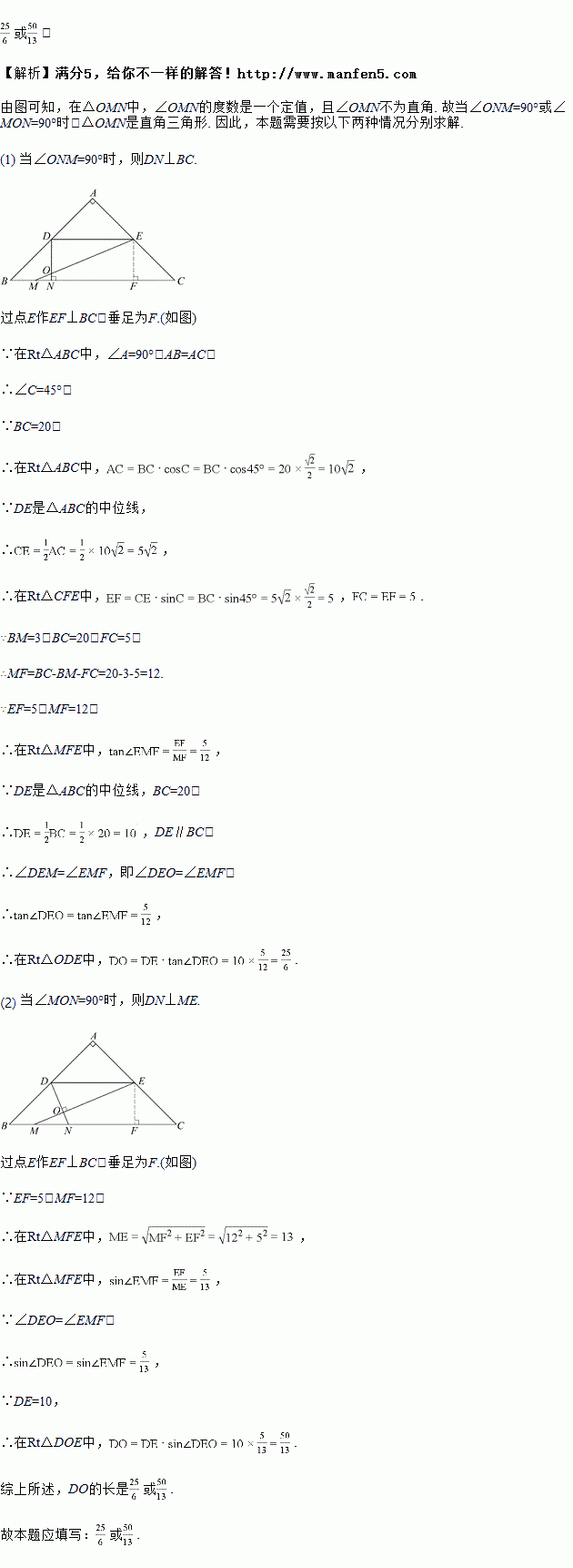 (2016辽宁省沈阳市)如图,在Rt△ABC中,∠A=90°,AB=AC,BC=20,DE是△ABC的中位线,点M是边BC上一点,BM=3,点N是线段MC上的一个动点,连接DN,ME,DN与ME相交于点O.若△OMN是直角三角形,则DO的长是______.