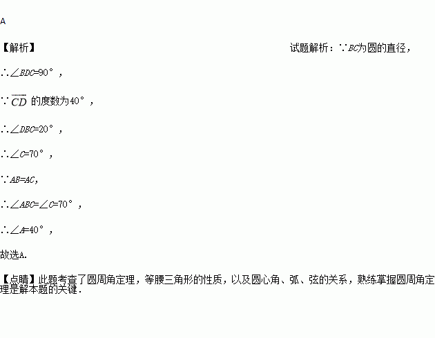 的度数为40°则∠A的度数是( )