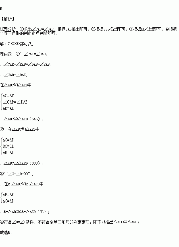 (2015秋•临清市期末)如图,已知AB=AE,AC=AD,增加下列条件:①∠CAE=∠DAB;②BC=ED;③∠C=∠D=90°;④∠B=∠E.其中能使△ABC≌△AED的条件有( )