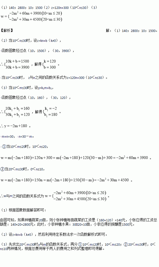 (3)设农庄支付给小张和小李的总费用为w(元),当10<m≤30时,求w与m之间的函数关系式.