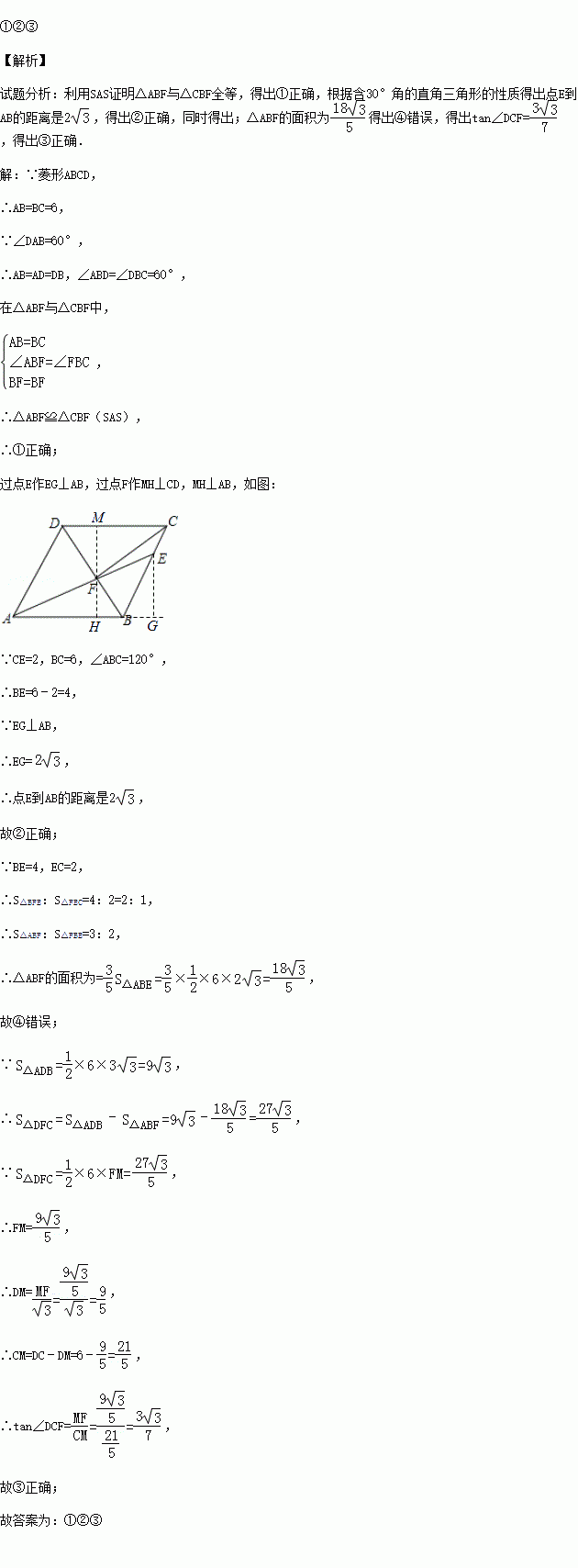 (2015•济南)如图,在菱形ABCD中,AB=6,∠DAB=60°,AE分别交BC、BD于点E、F,CE=2,连接CF,以下结论:①△ABF≌△CBF;②点E到AB的距离是2