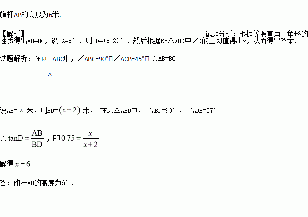 如图,要测量旗杆AB的高度,在地面C点处测得旗杆顶部A点的仰角45°,从C点向外走2米到D点处,(B、C、D三点在同一直线上)测得旗杆顶部A点的仰角为37°,求旗杆AB的高度.(参考数据:sin37°≈0.60,cos37°≈0.80,tan37°≈0.75)