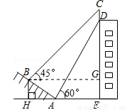 试题分析:过B作DE的垂线,设垂足为G.分别在Rt△ABH中,通过解直角三角形求出BH、AH;在△ADE解直角三角形求出DE的长,进而可求出EH即BG的长,在Rt△CBG中,∠CBG=45°,则CG=BG,由此可求出CG的长然后根据CD=CG+GE-DE即可求出宣传牌的高度.