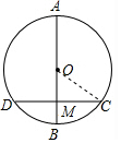 解答 解:连接OC,∵直径AB⊥CD,∴CM=DM=$\frac{1}{2}$CD=4cm,设圆的半径是r,∵M是OB的中点,∴OM=$\frac{1}{2}$r,由勾股定理得:OC2=OM2+CM2∴r2=($\frac{1}{2}$r)2+42,解得:r=$\frac{8\sqrt{3}}{3}$,则直径AB=2r=$\frac{16\sqrt{3}}{3}$(cm).