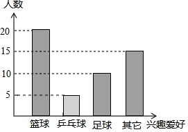 (2)本次抽样调查中最喜欢乒乓球活动的学生数是:50-20-10-15=5(人),