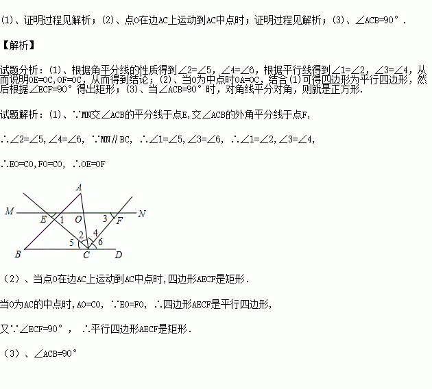 如图,在△ABC中,点O是AC边上的一动点, 过点O作直线MN//BC, 设MN交∠BCA的平分线于点E,交∠BCA的外角平分线于点F.