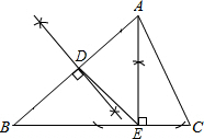 (2)以点A为圆心,以任意长为半径画弧,与BC相交于两点,再以这两点为圆心,以大于这两点间的距离的一半为半径画弧,相交于一点,过点A与这点作直线与BC相交于一点,则这点即为点E;