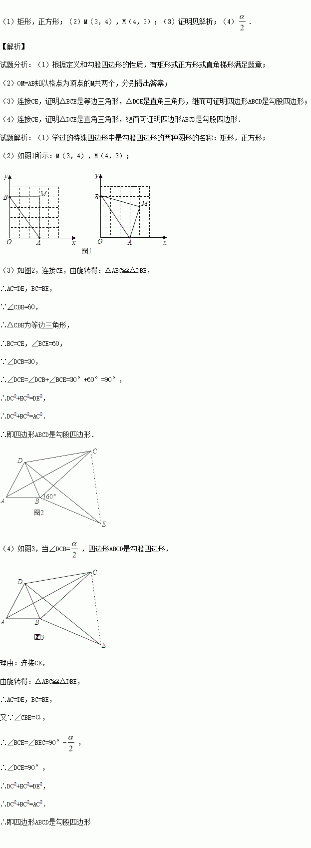 (2)如图1,已知格点(小正方形的顶点)O(0,0),A(3,0),B(0,4),请你直接写出所有以格点为顶点,OA、OB为勾股边且有对角线相等的勾股四边形OAMB的顶点M的坐标.
