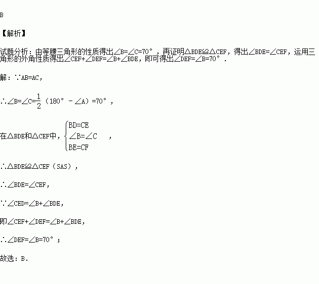 (2015•邗江区二模)如图,△ABC中,AB=AC,BD=CE,BE=CF,若∠A=40°,则∠DEF的度数是( )