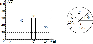 分析 (1)先利用C类项目的人数除以它所占的百分比得到总人数,然后利用总人数分别减去A类项目、C类项目和D类项目的人数即可得到B类项目的人数,再补全条形统计图;
