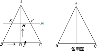 如图,在△ABC中,AB=AC,AD⊥BC于点D,BC=10cm,AD=8cm.点P从点B出发,在线段BC上以每秒3cm的速度向点C匀速运动,与此同时,垂直于AD的直线m从底边BC出发,以每秒2cm的速度沿DA方向匀速平移,分别交AB、AC、AD于E、F、H,当点P到达点C时,点P与直线m同时停止运动,设运动时间为t秒(t>0).
