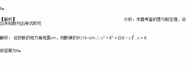 如图,由于台风的影响,一棵树在折断前(不包括树根)长度是16m,树顶落在离树干底部8m处,则这棵树在离地面________________处折断.