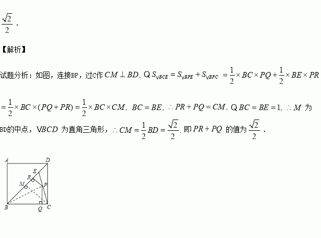 如图,E是边长为1的正方形ABCD对角线BD上一点,且BE=BC,P为CE上任意一点,PQ⊥BC于点Q,PR⊥BD于点R,则PQ+PR的值为 。