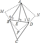 分析 把△ABE和△ADE分别沿直线AB,AD翻折得到△AMB与△AND,于是得到∠1=∠2,∠2=∠4,由于∠BAD=45°,得到∠MAN=90°,延长MB,NB交于F,得到四边形AMFN是正方形,设AM=x,则BF=x-3,DF=x-2,根据勾股定理得到BD2=BF2+DF2,列方程求得AM=6,根据勾股定理得到AB=$\sqrt{A{M}^{2}+B{M}^{2}}$=$\sqrt{{6}^{2}+{3}^{3}}$=3$\sqrt{5}$,AC=$\sqrt{A{N}^{2}+D{N}^{2}}$=$\sqrt{{6}^{2}+{2}^{2}}$=2$\sqrt{10}$,即可得到结论.