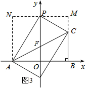 (3)先利用待定系数法求直线AC的解析式,确定F的坐标,求出△AOF的面积,分类讨论:设P(0,t),当P在y轴正半轴上时,过P作MN∥x轴,AN∥y轴,BM∥y轴,利用S△APC=S梯形MNAC-S△ANP-S△CMP=4可得到关于t的方程,再解方程求出t;当P在y轴负半轴上时,运用同样方法可计算出t.