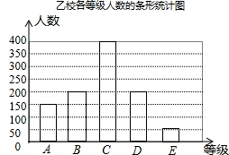 分析 (1)由甲的扇形统计图可求出总人数,进而可得两校选派的学生人数;由A,D,C,E所占的百分比可求出B的百分比,进而可求出B等成绩人数在扇形统计图中的圆心角,求出乙校B组的人数即可将乙校学生得分条形统计图补充完整;